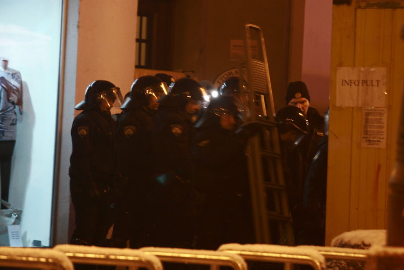 On 11 February 2010 at 03.30 around 100 riot police arrested 23 activists from Green Action and the Right to the City initiative in Zagreb, Croatia. The raid took place just hours after 4000 people turned out in snowy conditions to protest against turning part of the pedestrian zone into a ramp for an underground garage planned as part of the Cvjetni shopping centre and luxury flats development in the old part of Zagreb.The operation aimed to remove the accommodation container which the groups had put on Varsavska Street pedestrian zone as a 24-hour info-point in order to block the beginning of works on the ramp, which is still under legal dispute. Activists inside of the container and on the roof peacefully resisted removal by locking themselves together using arm tubes, and were arrested after the fire brigade cut the tubes. Around 50 more activists blocked the road exits of the lorry carrying the container but were also removed by the riot police.